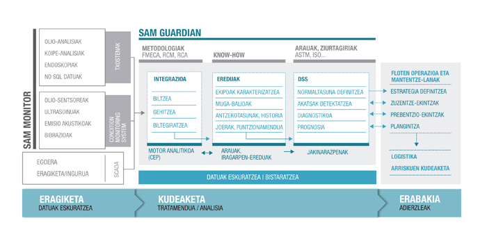 Sistemen funtzionamendu okerrak detektatu, diagnostikatu eta aurreikusteko helburuarekin (sistema mekatronikoak izan ohi dira), IK4-TEKNIKERek teknologiak eta esperientzia konbinatzen ditu. Hala, mantentze-lanen itzulkina maximizatu egiten du, aktiboen erabilgarritasuna handitu, haien bizia luzatu eta eragiketa-kostuak murriztu. Horretarako, metodologia propio bat sortu dute SAM Guardian eta SAM Monitor plataformek osatua.