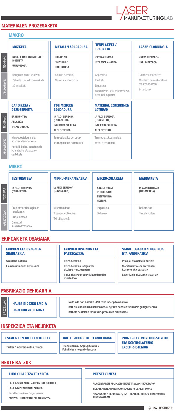 Joera horren jakitun, ia 20 urtez laser teknologiaren garapenean jardun ondoren eta eskakizun horiei erantzute aldera, IK4-TEKNIKER-ek “Laser for Manufacturing Lab” sortu du, laser-teknologietan oinarritzen den irtenbide orokorrak ematen dituena, fabrikazio aurreratuari aplikatzeko ikuspegi integral batetik: fabrikazio-prozesuak (hari bidezko LMD metodoan espezializatuak), ekipamenduen eta osagaien diseinua eta fabrikazioa; fabrikazio gehigarria; ikuskapena eta neurketa.