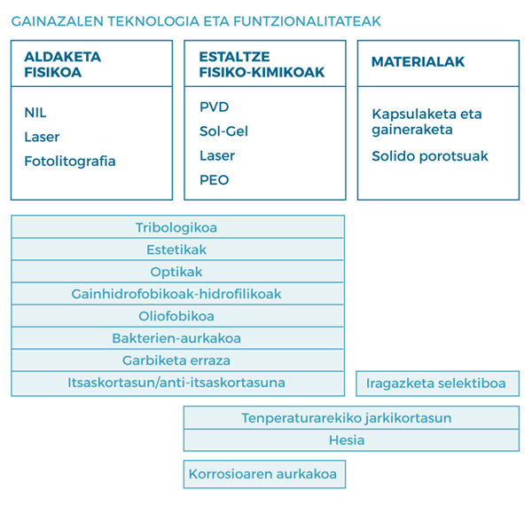Badira zenbait teknologia, hala nola, gainazalen estaldura edo egituratzea eskala mikro eta nanoskopikoan, gainazalen propietateak aldatzea ahalbidetzen dutenak; hala, ezarpen bakoitzaren eskakizunen arabera erabakiko da zeintzuk diren teknologiarik egokienak, gogoan hartuz enpresa bakoitzaren ekoizpen-beharrak eta bere industria-prozesuetan integratzeko modua.