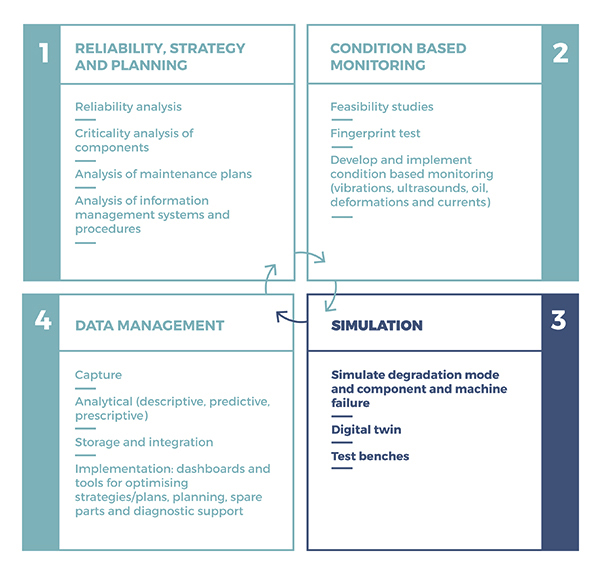 Simulation techniques also play an outstanding role as regards enriching predictive models. Virtual simulation allows you to characterise the digital model (digital twin) of a piece of equipment and simulations performed on test benches can deliver behaviour characterisations by testing equipment under extreme conditions.